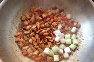 6.等湯汁燉幹瞭後,就可以放入花生米,蔥段瞭哦,翻炒幾次就可以出鍋瞭
