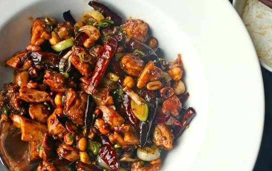 這款經典的中國雞肉炒鍋裡滿是四川花椒,辣椒和香料。用非常熱的炒鍋烹飪混合物會使其產生額外的煙熏味,稱為炒鍋。