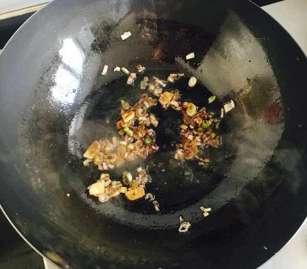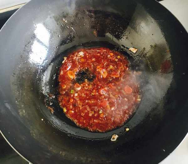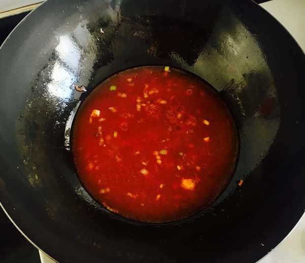 熱鍋加入適量的花生油,放入蔥花、蒜片爆香,料酒、生抽、香醋烹鍋,加入適量番茄醬攪拌均勻,再加入少許清水