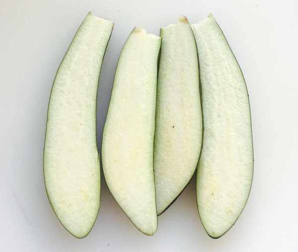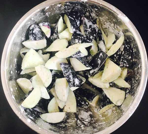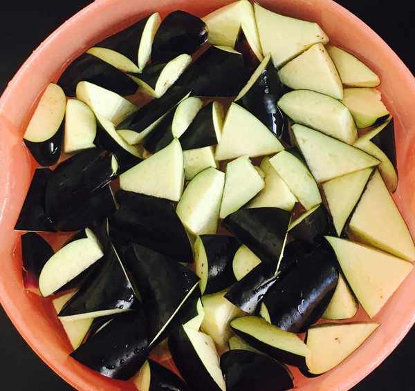 新鮮茄子掰去茄子蒂,用清水反復沖洗幹凈,清洗幹凈的茄子豎刀從中間切開一分為二,切成大小均勻的滾刀塊。為瞭防止氧化變色,切好的茄子塊放入清水中浸泡