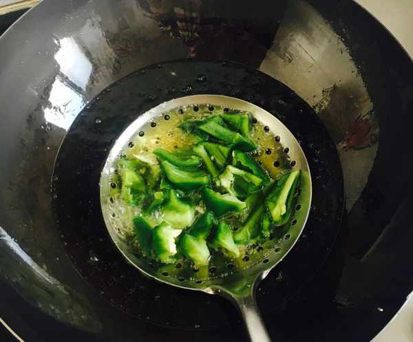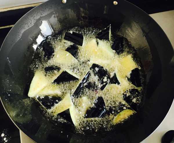 切好的茄子塊兒放入容器中,倒入適量的淀粉攪拌使茄子塊兒均勻的粘上淀粉,熱鍋加入適量的花生油,油溫六到七成熱時放入茄子塊炸至金黃即可,撈出控一下油,炸完茄子塊兒後,放入切好的辣椒片過一下油即可,撈出控油備用