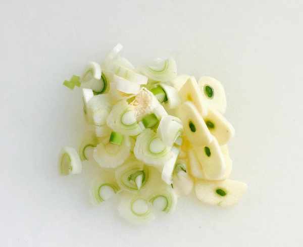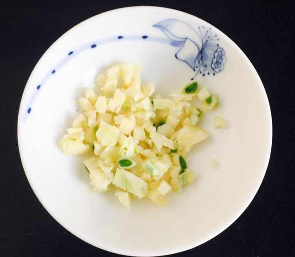 青椒一個用水清洗幹凈,去除蒂部和種子切成滾刀片,蔥、蒜剝去外皮清洗幹凈,分別切成蔥花、蒜片,再取兩瓣蒜用刀拍碎切成蒜末兒