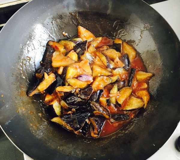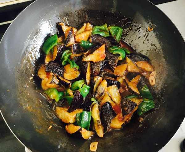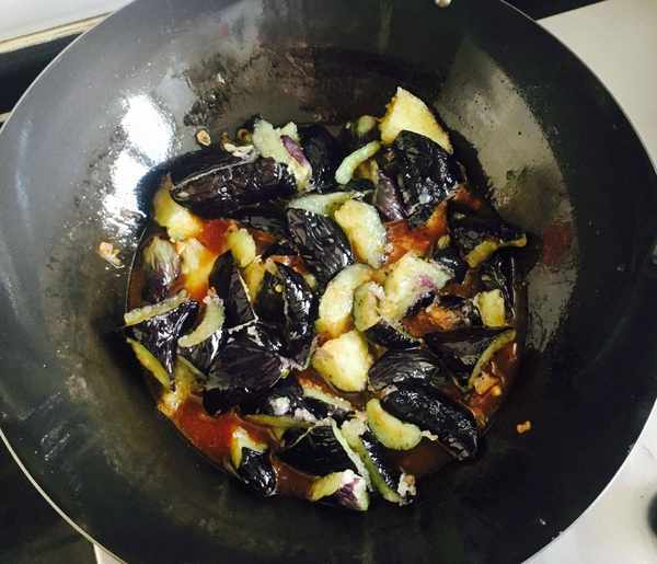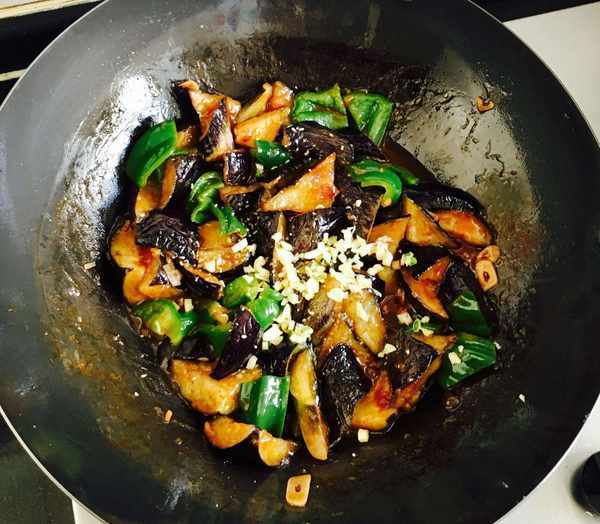 倒入切好的茄子塊兒,加適量的鹽調味兒並且翻炒均勻,炒至湯汁濃稠時倒入辣椒片翻炒均勻即可關火