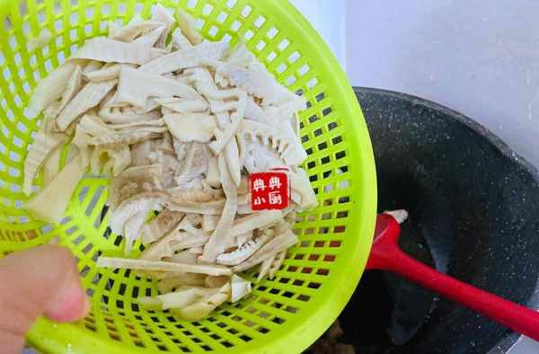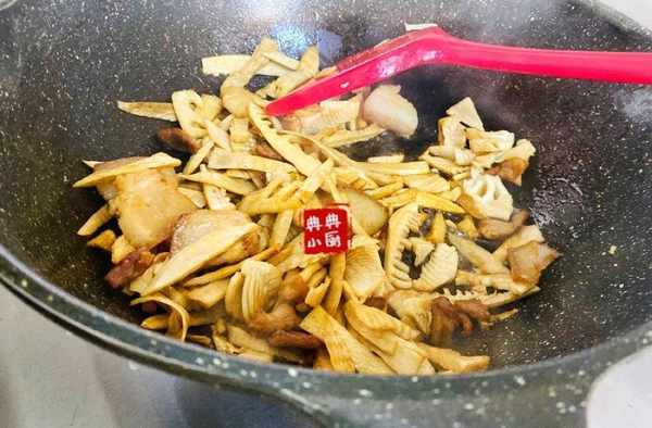 五花肉炒好之後,把泡發之後的筍幹倒進去,如果覺得泡好之後的筍幹太大瞭可以切一下。