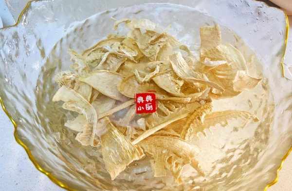 筍幹用溫水泡開,這個最好提前一晚泡一下,因為曬得比較幹,急泡的話不容易泡發開。