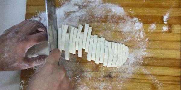 3把面皮繞在搟面杖上,把搟面杖抽出,切成寬條。