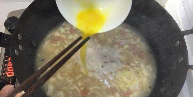 8加入打散的蛋液煮開成蛋花。