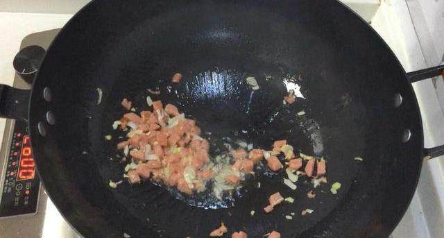 5起鍋熱油,爆香蔥末,薑末,放入火腿丁煸炒