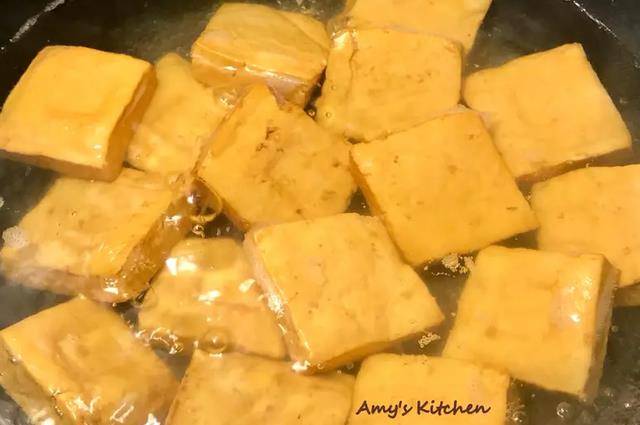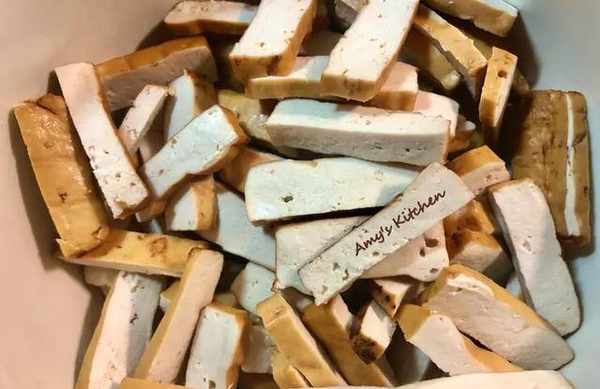 1、豆幹每片洗過,水滾加1/2小匙鹽巴(不在材料裡),蓋上鍋蓋汆燙5分鐘。豆幹夾出放涼再切。
