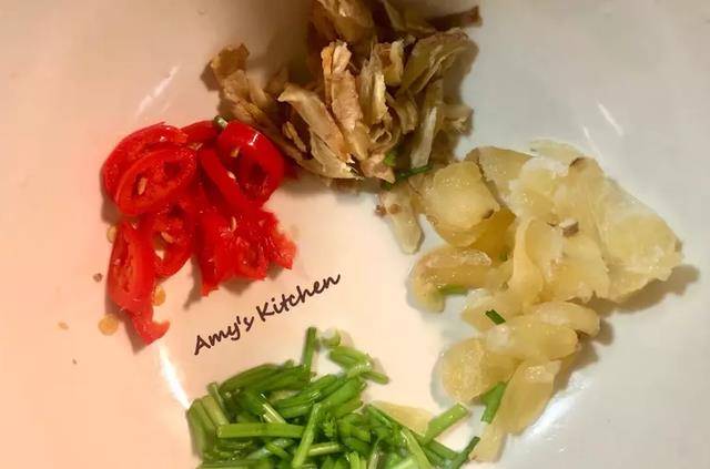 3、煮豆幹時間準備調料,蒜剝膜切片或拍碎、辣椒洗過剪圓片、薑洗過切片再切粗絲(末)、香菜梗剪末。
