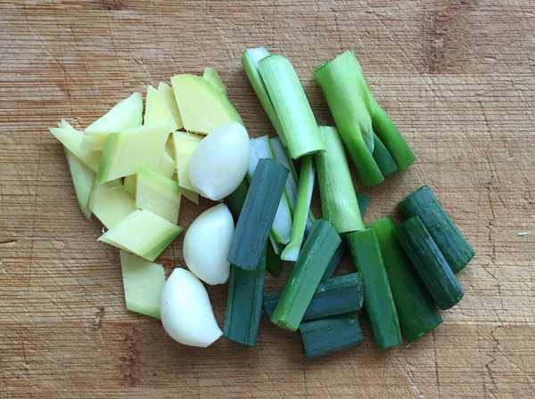 蔥、薑、蒜剝去外皮清洗幹凈分別切成蔥段、薑片,茴香梗、幹紅辣椒洗凈備用。青椒去蒂和種子清洗幹凈切成滾刀塊備好