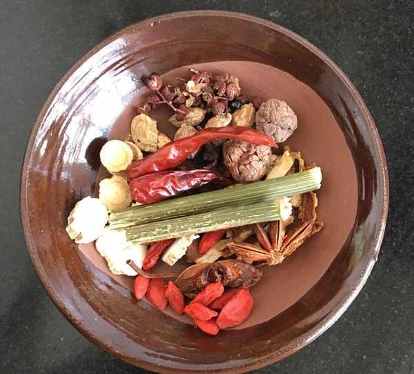 花椒、八角、茴香、丁香、陳皮、白芷、甘草、肉蒄、枸杞、白果、砂仁適量沖洗幹凈放入調料盒中備好