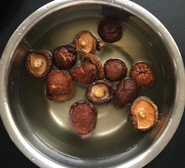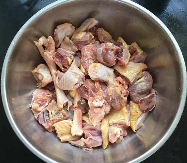 大公雞半隻清洗幹凈後斬成大塊,然後再用清水浸洗去一下血水並控幹水分備用,幹香菇清洗幹凈雜質控幹水分備用。