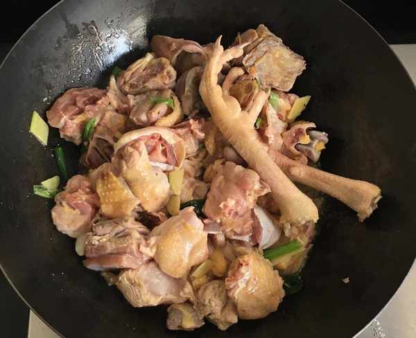 熱鍋加入適量的花生油把蔥、薑、蒜爆香倒入雞塊翻炒均勻