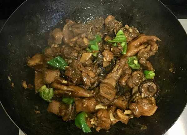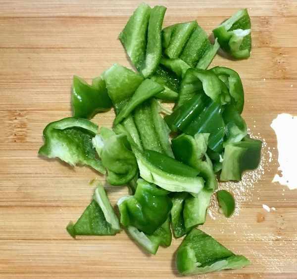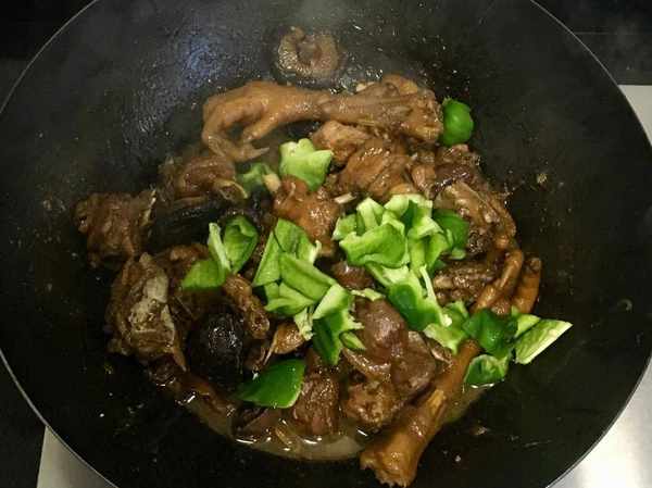 還有少許湯汁時放入青椒塊翻炒幾下使其斷生後即可關火