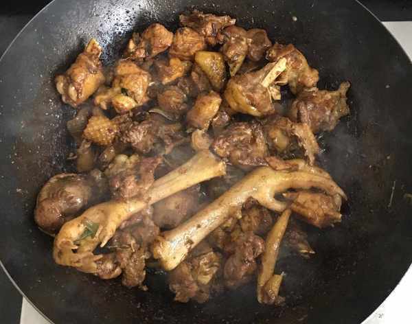 直到炒幹雞肉內的水分後加入適量的醋、料酒、生抽、白糖、白胡椒粉繼續翻炒均勻,加入適量的清水放入茴香梗、幹紅辣椒、調料盒和幹香菇,蓋好鍋蓋大火煮開轉小火慢燉