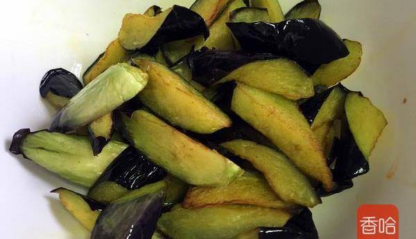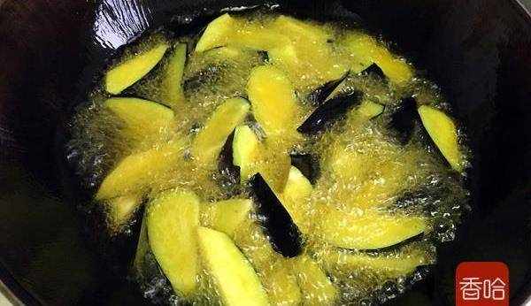 6.油再燒熱,放入茄子塊炸制。
