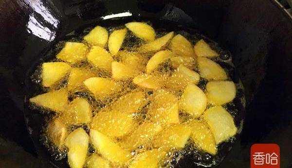 3.鍋內放油燒至五成熱,放入土豆塊炸制。