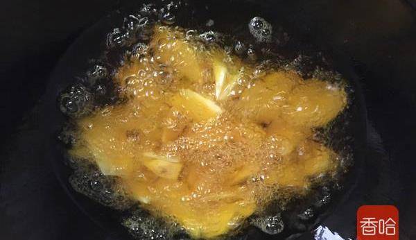 7.炸金黃色後撈出瀝幹油分。