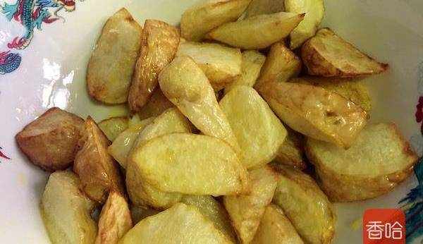 4.當土豆塊表面鼓脹起來,並漂浮在油面上,呈金黃色就炸熟瞭。