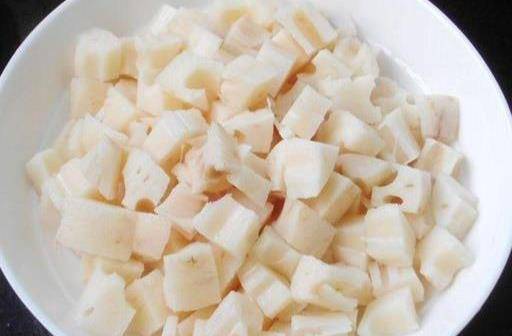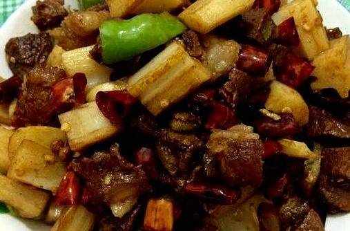 切配:牛腩洗凈,分成兩塊,川水,備用。藕和二荊條切丁,用水泡去淀粉,川水備用。幹辣椒剪成節和花椒一起用水浸泡。