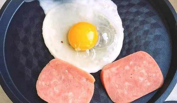 2.電餅鐺預熱刷少許食用油,打入一顆雞蛋、兩片火腿,小火慢煎;