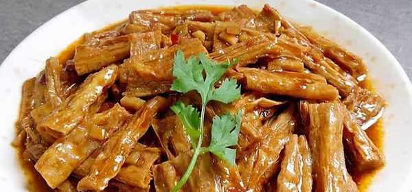 素燒腐竹柔韌無硬芯,味道香濃口感棒,是非常適合下飯的一種傢常菜。素燒腐竹在傢中做的時候,隻需要提前將腐竹泡發,等腐竹泡發後撈出,起鍋燒油,油熱後倒入薑末、蒜瓣、腐竹煸炒,之後加入少量水,加入生抽、蠔油、少許鹽、大火燒開,轉中火將腐竹悶燒入味到2-3分鐘,將腐竹燒制變軟,撈出盛盤即可。
