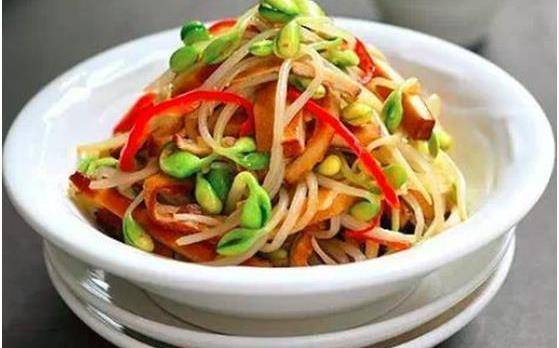 做法:1、黃豆芽去根,洗凈瀝幹水份。香幹切成長條,紅椒去籽切成細條,大蒜去皮切成厚片;