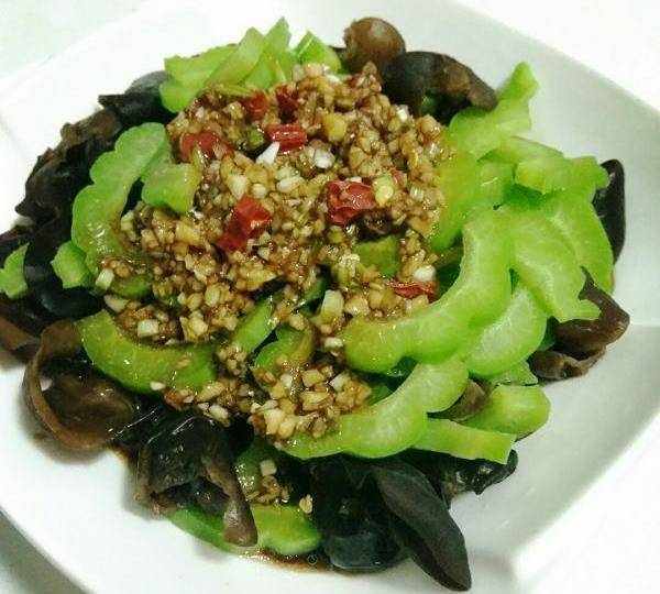 材料:苦瓜,木耳,蔥、蒜、辣椒醬,鹽、糖、橄欖油,耗油、生抽醬油