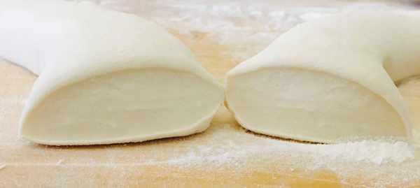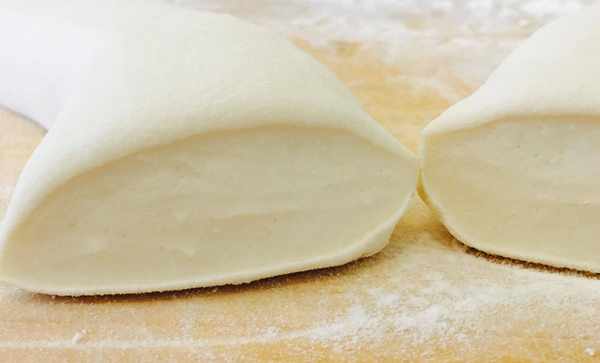 如果想知道面是否揉好瞭可以用刀切開,切面沒有孔洞即是揉面成功,這樣做出來的饅頭暄軟而且有嚼勁兒