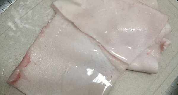 1、買回來的豬皮先用菜刀刮去豬皮上的肥肉,整塊洗凈備用;