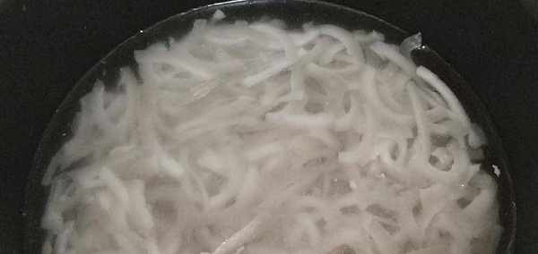 2、燒開水後,將豬皮放入鍋內煮1-2分鐘焯水;