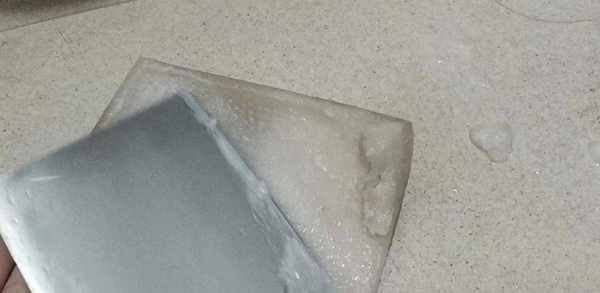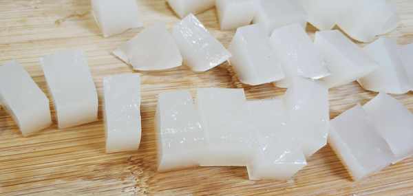 6、把豬皮湯從冰箱取出,這時已經凝結成果凍瞭,再把果凍切成小塊,方便使用;