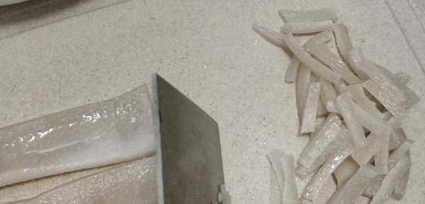 3、豬皮焯水後撈出來,沖冷水,再次用菜刀刮去內層上的肥肉,盡量刮幹凈,去肥肉後豬皮切成小長條;