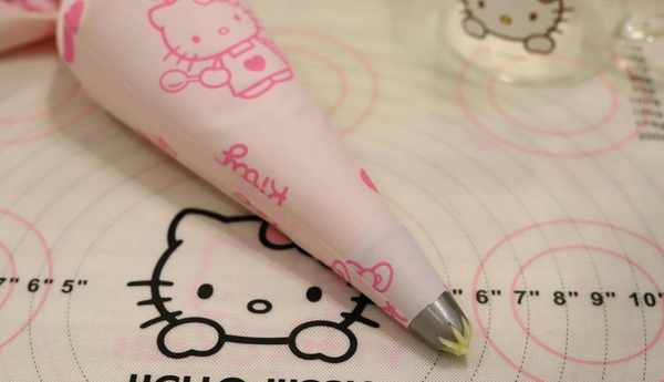 8.之後把珍妮曲奇花嘴裝到裱花袋上,把壓拌好的曲奇的面團放到裱花袋裡面。