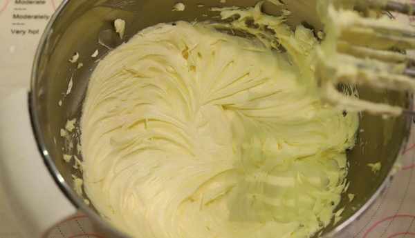 3.把黃油用電動打蛋器打發到膨脹變白。