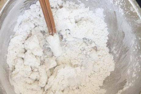 步驟一:先將紅糖放入小碗中,加入熱水使其融化變成糖水,糯米粉放入另一個碗中,分多次慢慢加入熱水,用筷子攪拌,攪拌成棉花狀。