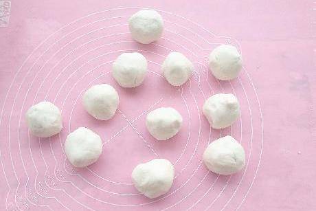 步驟二:準備好的棉花狀糯米團冷卻後,用手揉成一個光滑的大面團,然後放在平躺的餐桌上,先將其搓成長條,在分割成大小適中的小團子,搓成小圓球。用手掌或者按壓板將小團子壓成扁圓狀,將所有的小團子都處理好,等待下鍋。