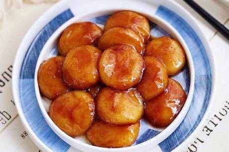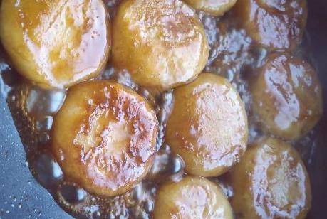 步驟四:鍋中的小圓餅,煎的那一面變色小圓餅形狀固定時,即可翻一面繼續煎。反復煎制,直到小圓餅兩面都煎硬,就可以將事先準備好的紅糖水倒入鍋中,並且翻動小圓餅,使紅糖水均勻的覆蓋。