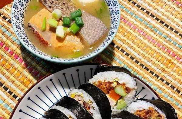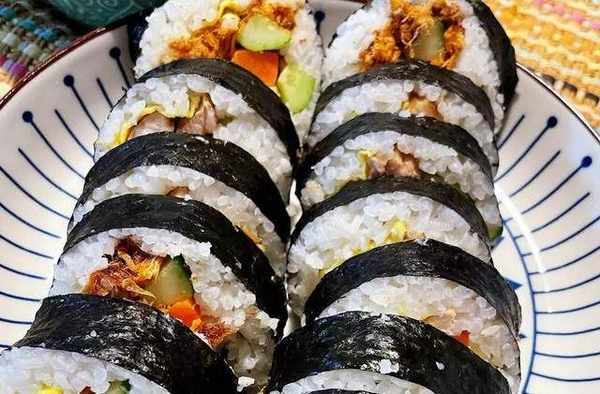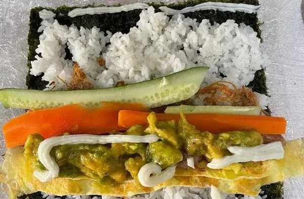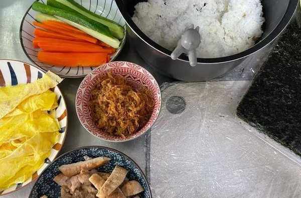 4、可以開始包壽司啦,紅蘿卜如果怕太生,用熱水川燙過滾就可以撈起來沖冷水備用。這個是我自己吃的,因為剛好有酪梨,所以我自己加瞭酪梨醬(酪梨加鹽加黑胡椒顆粒,攪拌就可以瞭)就把它們卷起來就可以啦。