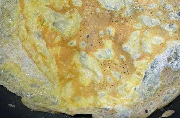2、煎熟就可以盛起來備用,蛋皮作法:雞蛋攪拌後,慢慢分兩次導入平底鍋,均勻的讓他平躺,熟後就可以整片用起來備用。