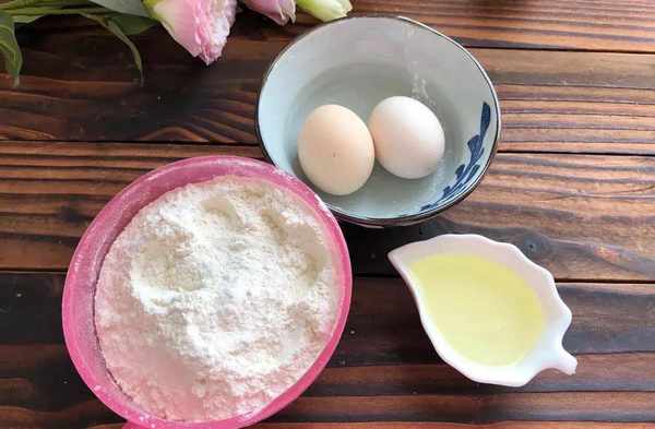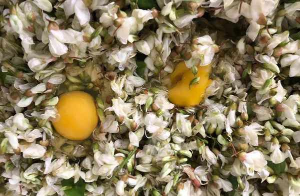 洋槐花400g,雞蛋2個,花生油20g,面粉1碗,鹽適量,花椒粒(花生油20g最後用)大蒜半頭