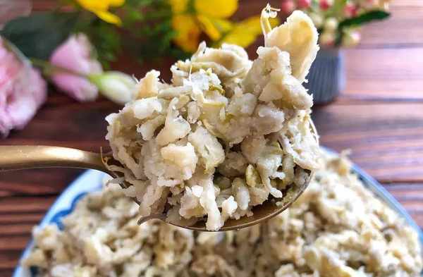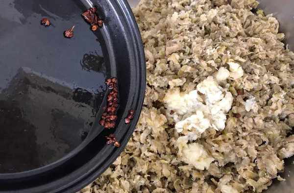 5、搗點蒜泥放入出鍋的槐花飯裡。