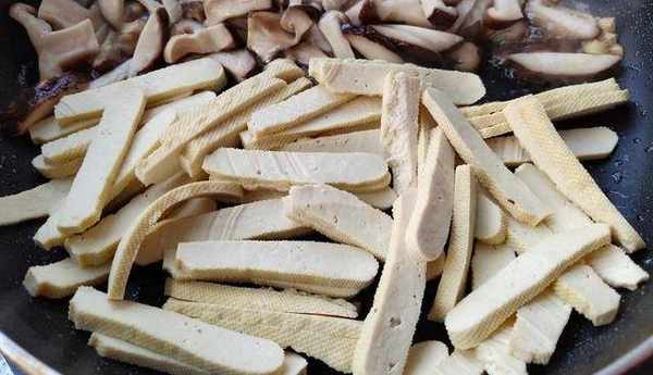 5、緊接著倒入豆幹翻炒均勻。豆幹不要焯水瞭,用清水洗一下就好,焯水豆幹味道會變淡,也會變得松散。