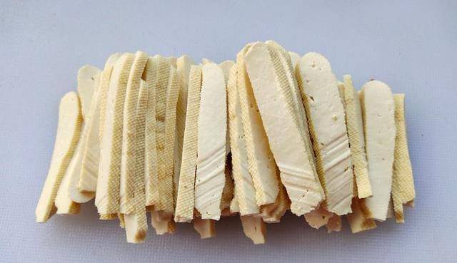 3、豆幹清洗一下,切成細條狀。市面上的豆幹約有兩種:一是五香味的,顏色比較深,已經調好味瞭;二是原味的,顏色呈乳白色。