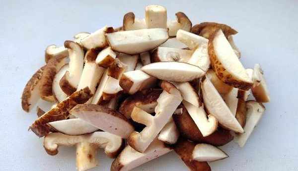 2、浸泡好後,用手微微擠出水分,放在面板上切成條狀。然後鍋中水燒開,把香菇倒進去焯兩分鐘,變軟變色撈出瀝去水分。