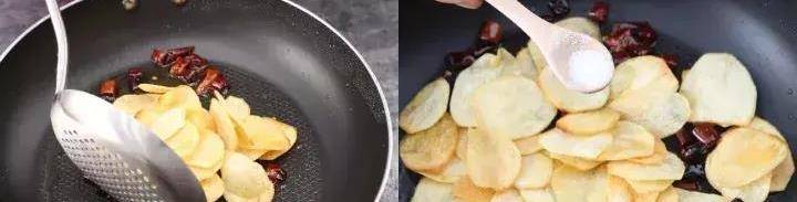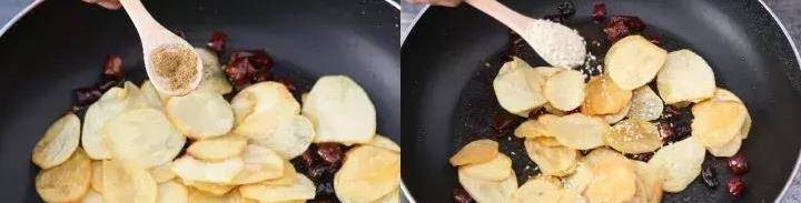 放入炸好的慈菇片,加適量鹽和十三香,最後撒少許白芝麻。