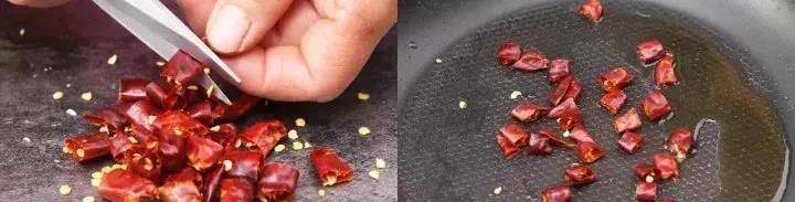 幹辣椒剪小段,熱鍋起油下入辣椒炒香。