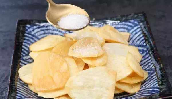 7、吃法一:炸好的慈菇片上撒一點糖。