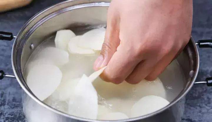 4、燒鍋水,水開時,放入切成片狀的茨菇,焯水,大概3-5分鐘後撈起。茨菇比較難熟,並且有股苦澀味,所以最好先焯水。